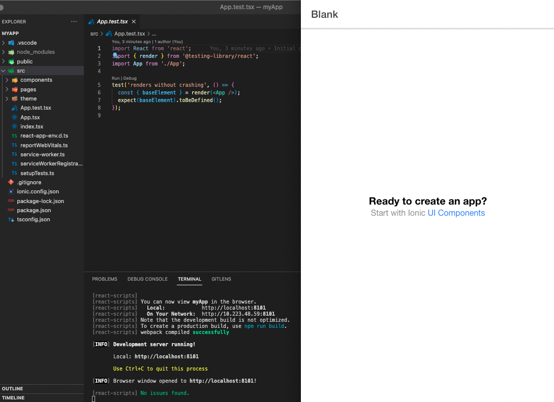 これにより、名前が「myApp」の新しいIonic Reactプロジェクトが作成されます。必要に応じてプロジェクト名を変更してください。