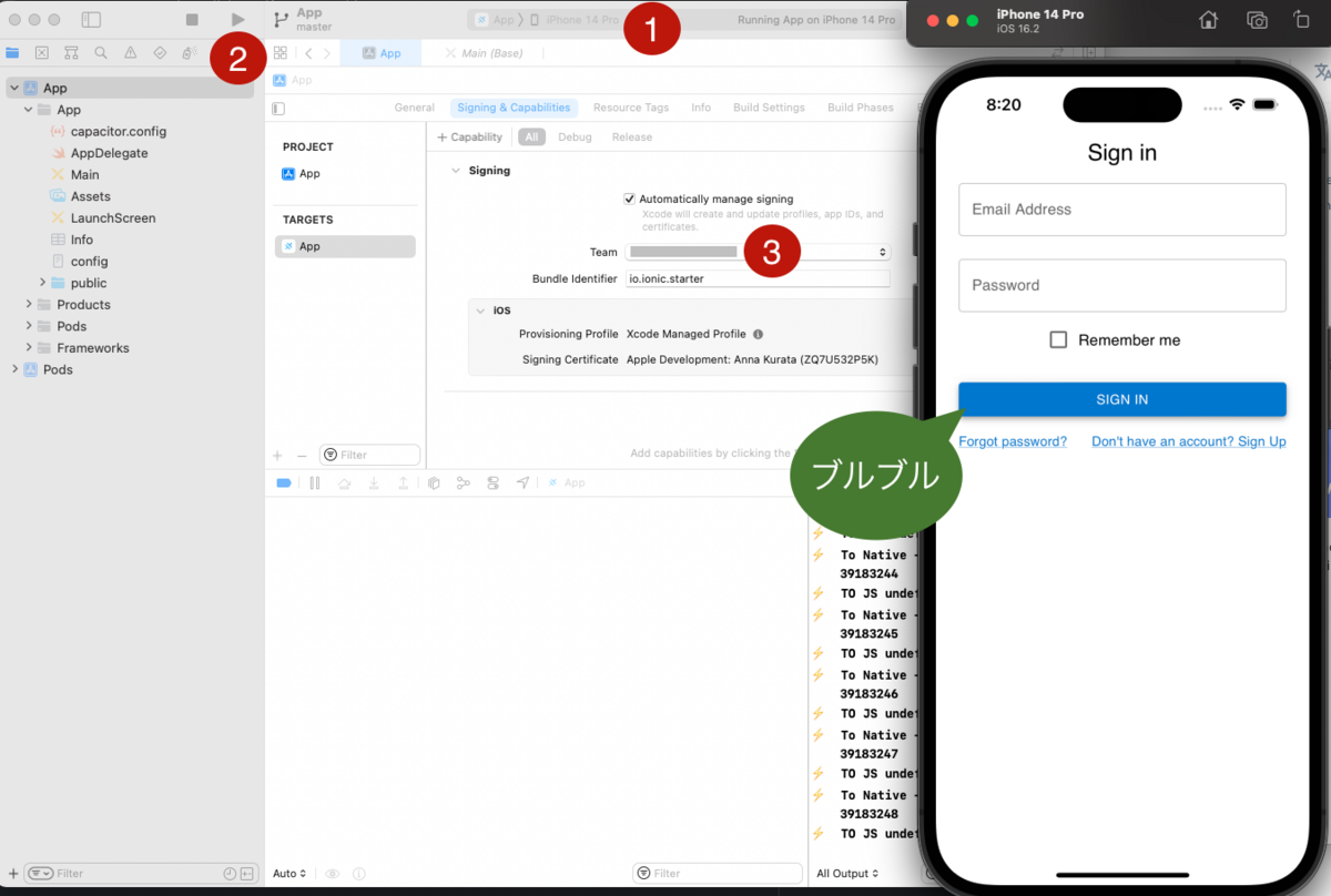 Xcode が起動したらiPhone/iPadをパソコンに繋げ、①で自身のデバイスを選択し、②で実行するとお手元のデバイスにインストールされます。