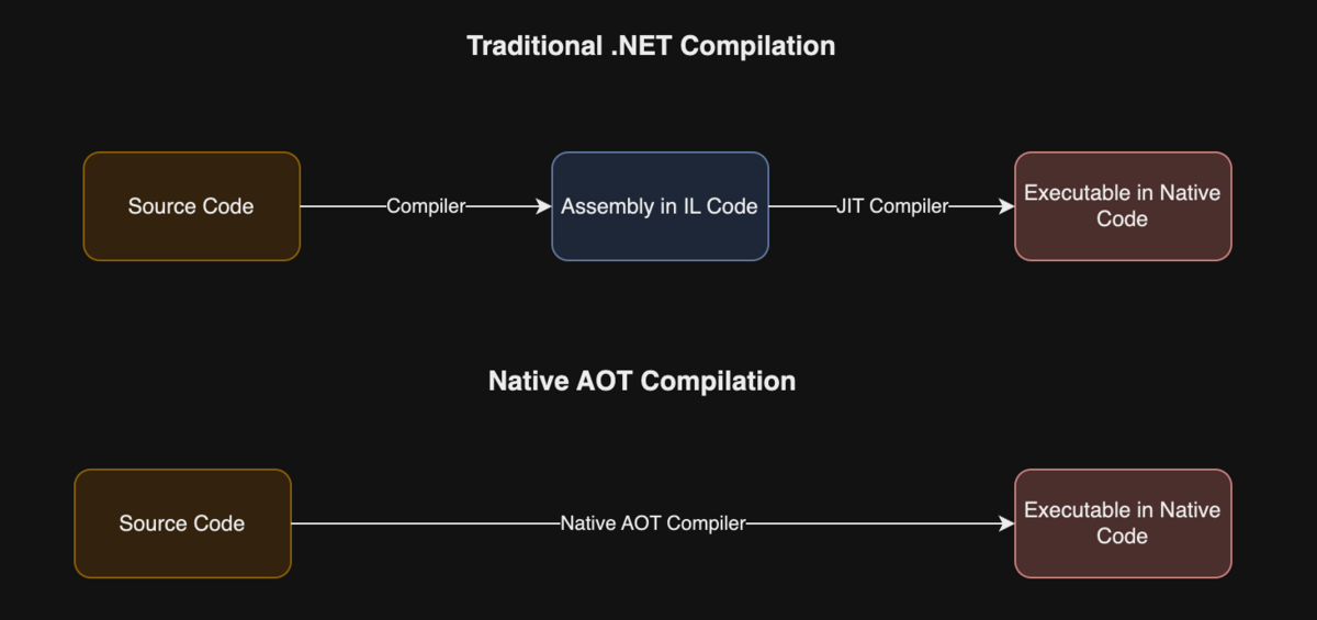In contrast to the traditional .NET compilation process, Native AOT compilation condenses this into a single step. It compiles the .NET code directly into native code, resulting in a single executable that does not rely on the .NET Runtime and executes directly on the CPU. The diagram below illustrates the comparison between the two methods.