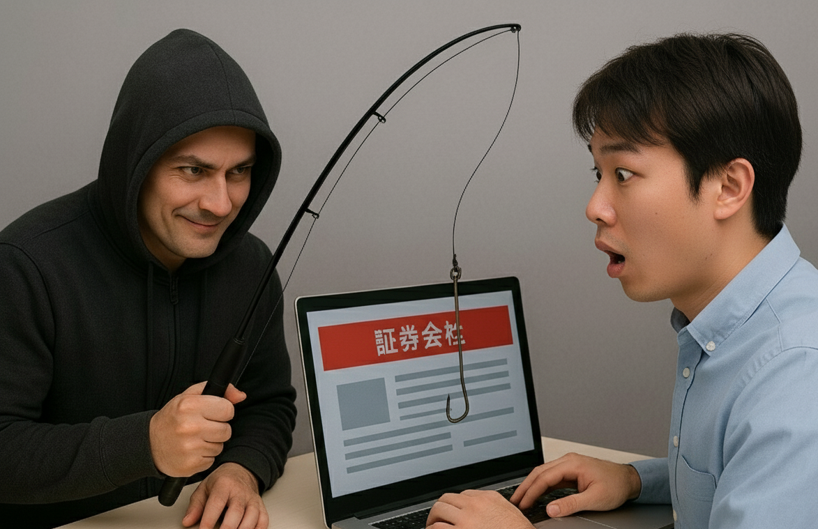 大手証券会社を装ったメールから偽サイトにアクセスさせ、入力したID・パスワードを盗み取ることで、口座の乗っ取りや不正送金につながります。